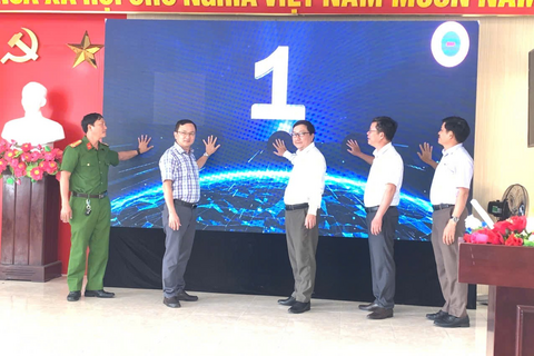 Ảnh 1: Các đại biểu thực hiện nghi thức khai mạc Lễ phát động phong trào Bình dân học vụ số xã Bình Minh