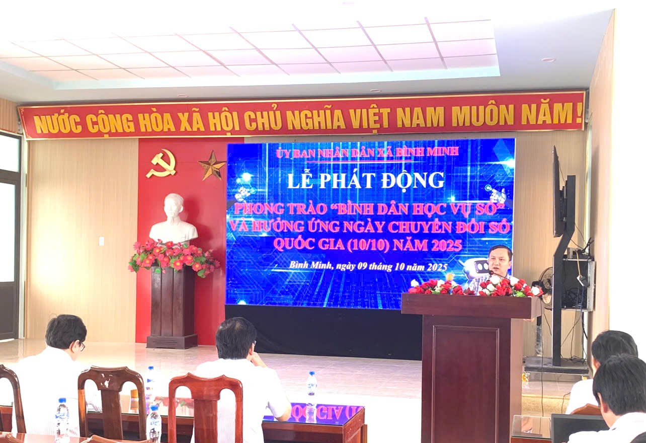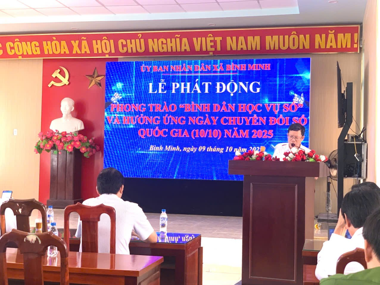 Chiều ngày 09/10/2025, tại Hội trường UBND xã, Ủy ban nhân dân xã Bình Minh đã tổ chức trọng thể Lễ phát động phong trào “Bình dân học vụ số” và hưởng ứng Ngày Chuyển đổi số Quốc gia (10/10) năm 2025.