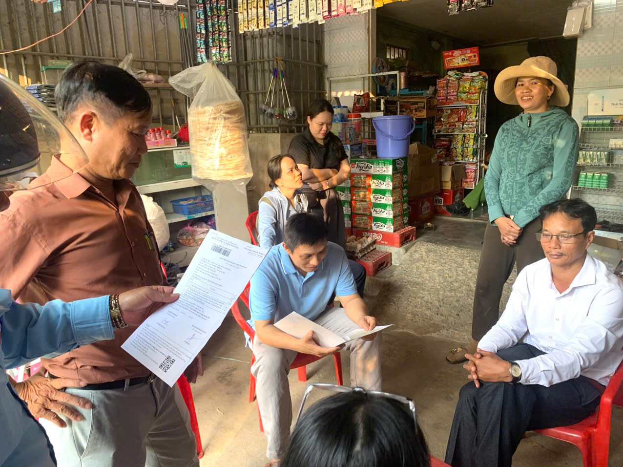 Ảnh 4: Đoàn kiểm tra VSATTP xã Bình Minh kiểm tra giấy phép của cơ sở kinh doanh.